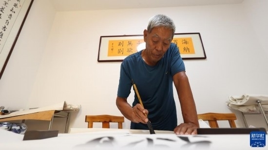 8月22日,老人在青縣曹寺鎮(zhèn)曹寺村的孝老食堂練習(xí)書法。