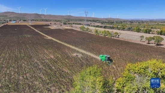 10月1日,在沽源縣白土窯鄉(xiāng)小西溝村,當(dāng)?shù)剞r(nóng)機(jī)手正在田間操作收割機(jī)收獲藜麥(無人機(jī)照片)。