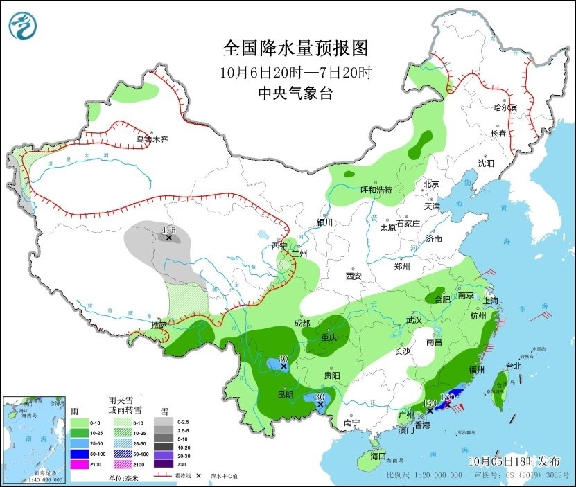 10月5日20時至6日20時,西藏東北部、青海中南部和東北部、甘肅西北部等地部分地區(qū)有小到中雪或雨夾雪,青海西北部局地有大雪;西藏東南部、陜西南部、四川盆地東部、重慶、貴州西部、云南東北部、湖北西部、廣東東部沿海、福建南部及臺灣島南部等地部分地區(qū)有中到大雨,其中,西藏東南部、臺灣島南部等地部分地區(qū)有暴雨(50~75毫米)。西藏西部、四川盆地中部等地有5~6級風(fēng)、陣風(fēng)7級,浙江沿海、福建沿海、廣東東部沿海、臺灣島西北部沿海等地有6~8級風(fēng)、陣風(fēng)9級(見圖1)。