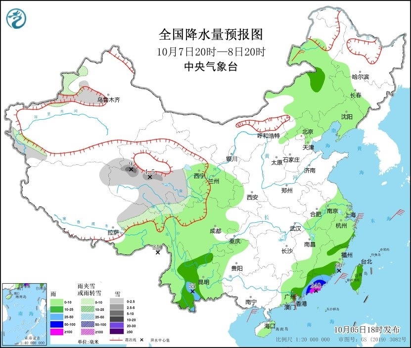 10月7日20時至8日20時,青海中南部、西藏東北部、新疆西部等地部分地區(qū)有小雪或雨夾雪,青海中部局地有中到大雪;四川南部、云南中部、浙江南部、福建南部、廣東東部、臺灣島等地部分地區(qū)有中到大雨,其中廣東東部、福建南部、云南南部等地部分地區(qū)有暴雨,廣東東部沿海地區(qū)局地有大暴雨(100~240毫米)。浙江、福建和廣東沿海等地有4~6級風(fēng)、陣風(fēng)7級;東海西南部及中部海域、臺灣海峽、南海東北部偏北海域有6~7級風(fēng)、陣風(fēng)8~9級(見圖3)。