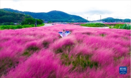 國(guó)慶期間,在浙江省寧波市北侖區(qū)梅山街道梅山灣水道沿線,游客在粉黛亂子草中游玩。