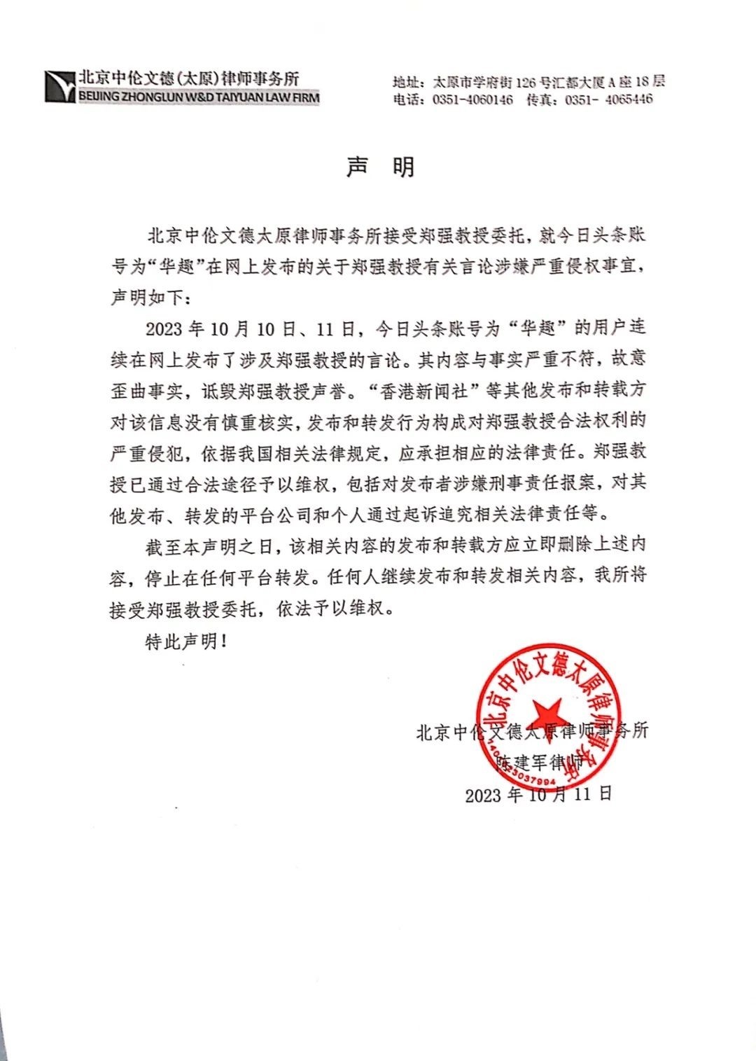 同時,北京中倫文德太原律師事務(wù)所接受鄭強教授委托發(fā)表聲明,稱將依法予以維權(quán)。