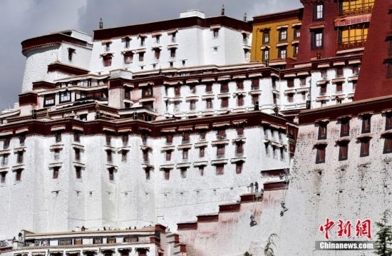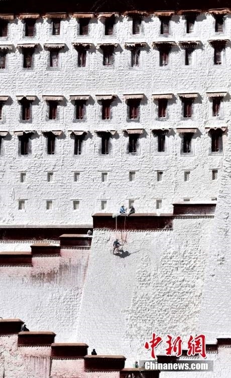 10月19日,西藏拉薩,工作人員對布達拉宮外墻噴灑涂料。每年秋冬交替時節(jié),布達拉宮外墻都要進行粉刷“美顏”。按照慣例,每季粉刷將在藏歷9月22日“神降節(jié)”前完成。