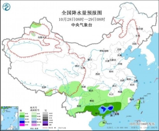 10月27日08時至28日08時,新疆北疆北部、西藏東部等地部分地區(qū)有小到中雪或雨夾雪,局地大雪(5~9毫米)。西南地區(qū)大部、江南大部、華南等地有小到中雨,局地大雨。