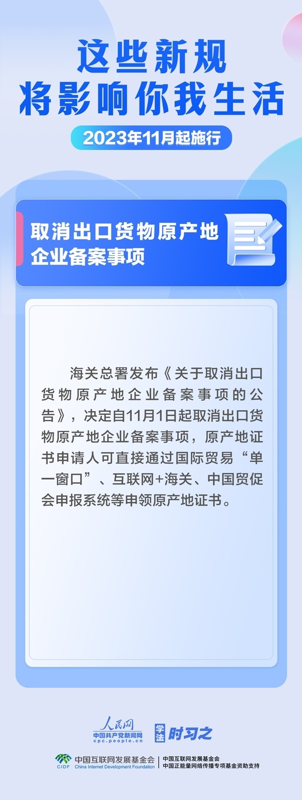 調(diào)整最高法知產(chǎn)法庭審理上訴案件范圍;簡(jiǎn)化債券發(fā)行人員任職資格審批程序;取消出口貨物原產(chǎn)地企業(yè)備案事項(xiàng)……11月,這些新規(guī)施行,將影響你我生活。