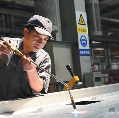 周晶輝正在對(duì)鋁合金車體進(jìn)行焊接。金萬(wàn)寶攝