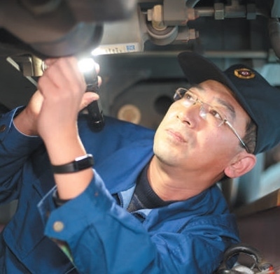 時(shí)而膝蓋微弓,腰部略彎;時(shí)而敲敲打打,上前細(xì)嗅……只見(jiàn)劉波進(jìn)車廂、鉆車底、登車頂,對(duì)列車逐一進(jìn)行檢查,不一會(huì)兒,動(dòng)車隱患就被及時(shí)發(fā)現(xiàn)并排除。