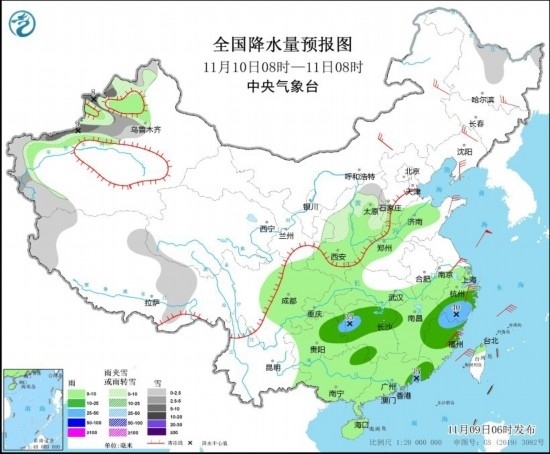 11月9日08時(shí)至10日08時(shí),新疆西部、內(nèi)蒙古東北部、黑龍江大部、吉林中東部、遼寧東北部等地部分地區(qū)有小到中雪或雨夾雪,其中,黑龍江東部、吉林東部、新疆南疆西部山區(qū)等地部分地區(qū)有大雪,局地暴雪。重慶東南部、貴州東部、湖北東部、湖南大部、蘇皖南部、上海、江西中北部、浙江大部、福建西北部以及廣西東北部等地部分地區(qū)有中到大雨,其中,江西西部和東北部、浙江西南部、福建西北部等地部分地區(qū)有暴雨(50~80毫米)。內(nèi)蒙古中東部、遼寧大部、華北東部和北部、黃淮北部、江南東部等地部分地區(qū)有4~6級(jí)風(fēng)(見圖3)。