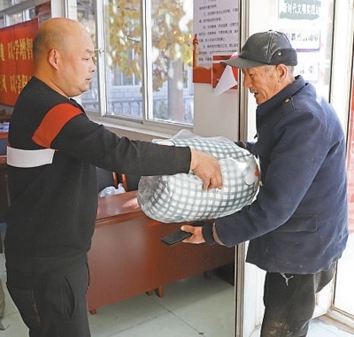 上午10時,走進(jìn)碼頭村黨群服務(wù)中心,正碰上73歲老人杜金亭騎著電動三輪車,載著老伴來領(lǐng)新棉被。為保障困難群眾冬季取暖,涿州市民政局為全市殘疾人、“六類人群”免費發(fā)放過冬棉被。杜金亭的老伴肢體殘疾,是低保戶?!靶路颗渖闲旅薇?,這個冬天不愁了!”取上新棉被,杜金亭邀請記者去新家看一看。