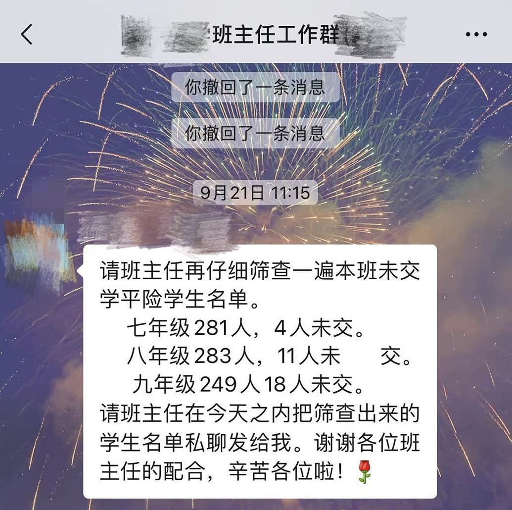 她要反復(fù)叮囑學生,同時在家長群一一驗收,“力求100%完成”。因為這些任務(wù)大多與她的績效掛鉤。但并非所有家長都愿意配合,因為需要確認的通知太多,她還為此被家長告到教育局。