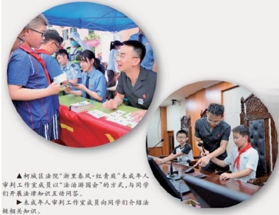 “‘紅青庭’品牌Logo中,‘紅’字既突出黨建統(tǒng)領(lǐng)又寓意紅領(lǐng)巾,是百折不撓的精神象征;‘青’字代表著青少年,是肩負(fù)未來的青春力量;‘庭’字則是指少年法庭和家庭。”胡衛(wèi)民介紹,柯城區(qū)法院依托“浙里春風(fēng)·紅青庭”品牌,成立青少年法治教育實(shí)踐基地和未成年人審判工作室,積極開展內(nèi)外聯(lián)動(dòng),在持續(xù)加強(qiáng)涉未成年人刑事、民事、行政審判融合的基礎(chǔ)上,不斷深化與公安、檢察、教育、團(tuán)委、婦聯(lián)等部門的協(xié)調(diào)配合,構(gòu)筑全方位、多鏈條的綜合司法保護(hù)機(jī)制。