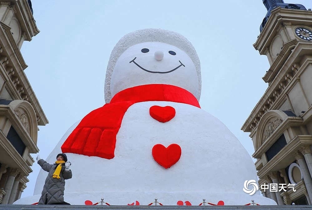 萌萌噠!哈爾濱巨型雪人亮相外灘廣場,吸引游人打卡。