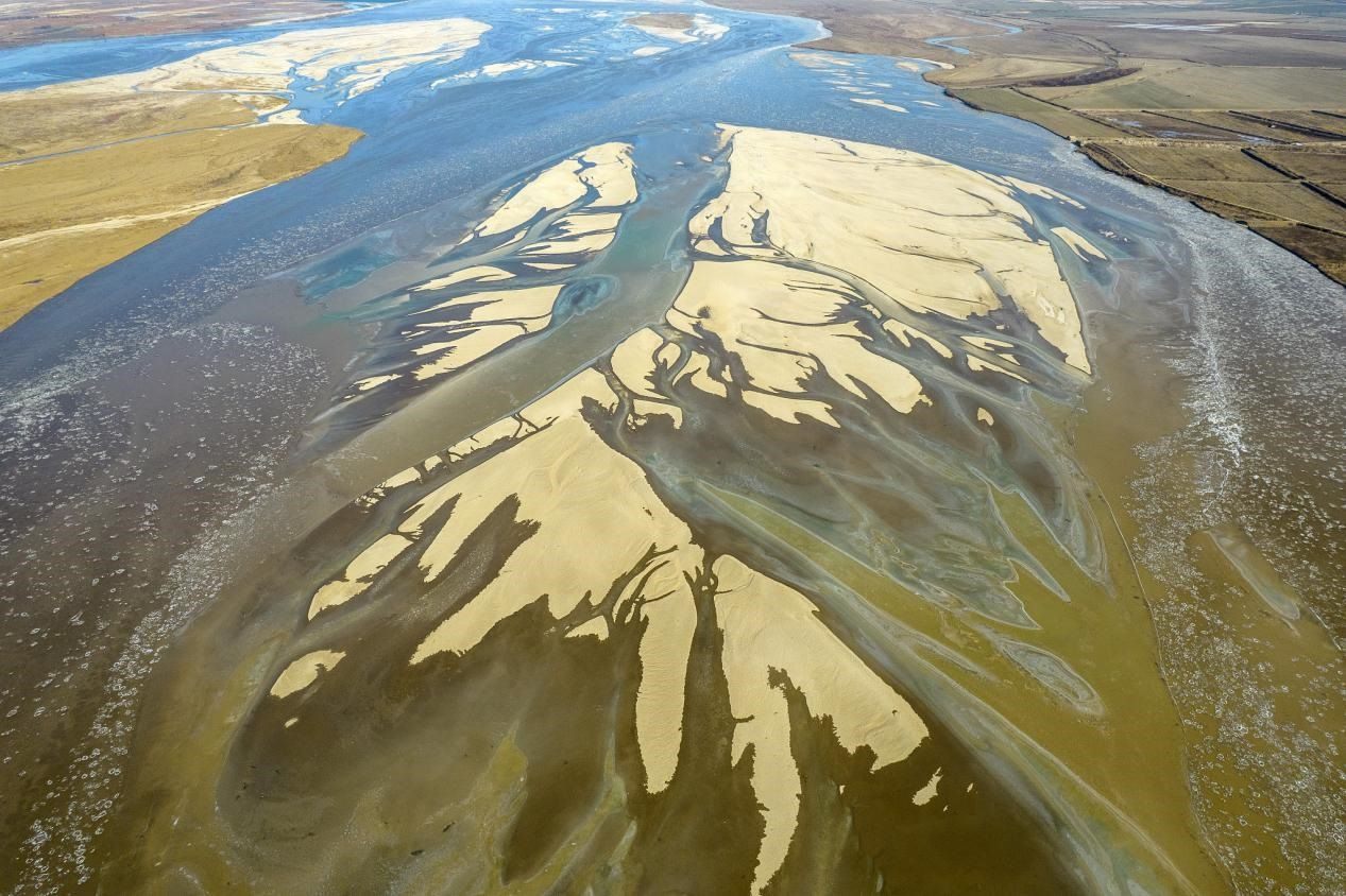 山西運城:黃河永濟段現(xiàn)流凌,宛如白色鱗片順流而下。