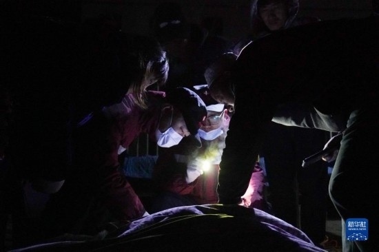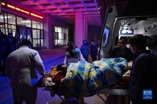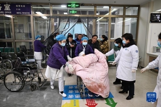 12月19日,在甘肅省臨夏回族自治州積石山保安族東鄉(xiāng)族撒拉族自治縣中西醫(yī)結(jié)合醫(yī)院門(mén)口,醫(yī)務(wù)工作者查看傷者情況。