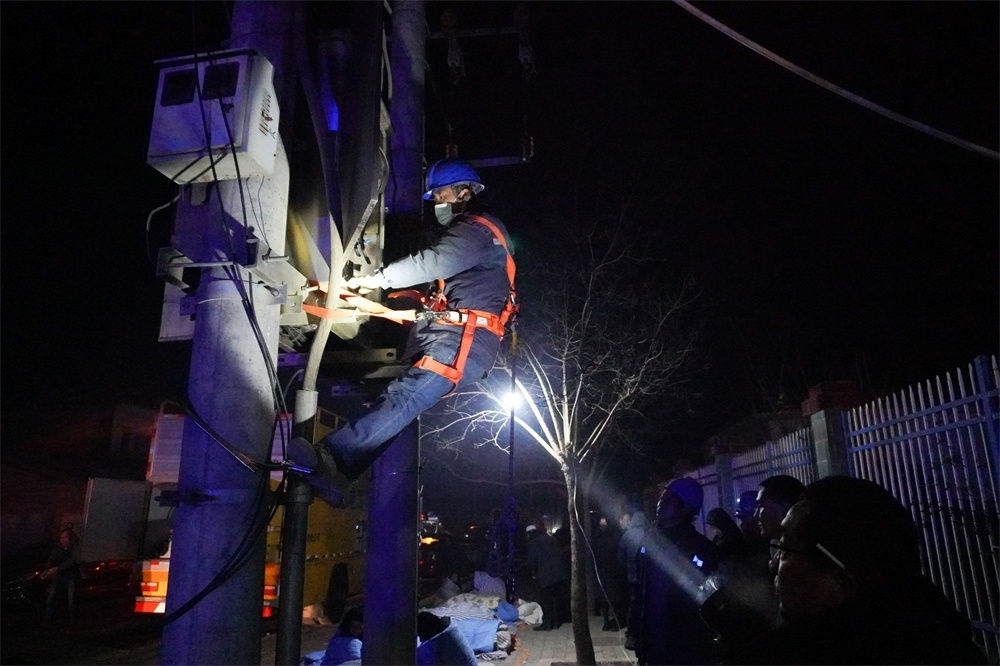 12月19日,在甘肅省臨夏回族自治州積石山保安族東鄉(xiāng)族撒拉族自治縣中西醫(yī)結(jié)合醫(yī)院門(mén)口,電力部門(mén)工作人員搶修電力設(shè)施。新華社記者 馬希平 攝