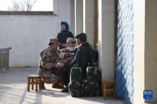12月19日,武警青??傟?duì)海東支隊(duì)衛(wèi)生隊(duì)醫(yī)師在青海省海東市民和回族土族自治縣中川鄉(xiāng)草灘村開展醫(yī)療保障。