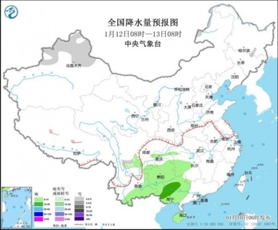 1月12日08時(shí)至13日08時(shí),新疆北疆北部、川西高原南部等地部分地區(qū)有小雪或雨夾雪。四川盆地南部、湖南西部、貴州、云南東部和南部、廣西、海南島等地部分地區(qū)有小到中雨。西藏中部部分地區(qū)有5~6級(jí)風(fēng);南海東部和西南部等海域有6~7級(jí)風(fēng)、陣風(fēng)8級(jí)。
