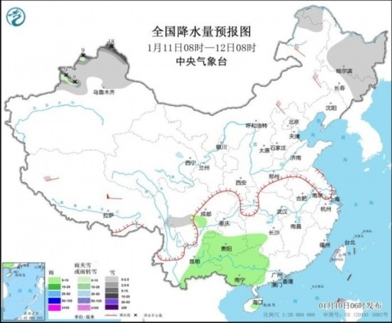 全國(guó)降水量預(yù)報(bào)圖(1月10日08時(shí)-11日08時(shí))
