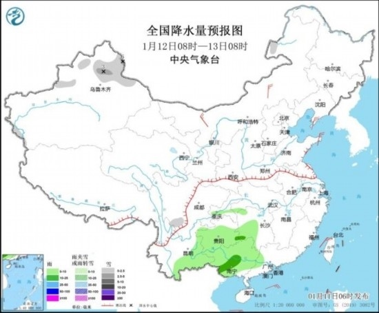 全國(guó)降水量預(yù)報(bào)圖(1月12日08時(shí)-13日08時(shí))