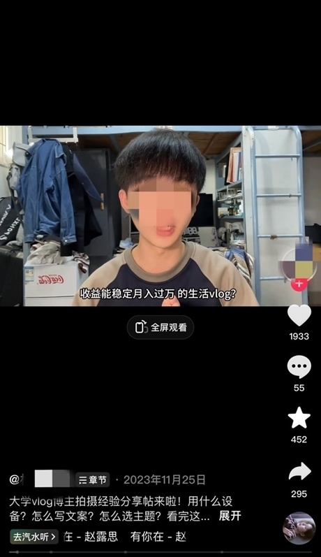 2023年11月25日,一名自稱(chēng)大學(xué)生的短視頻博主向大學(xué)生網(wǎng)友分享自己如何零基礎(chǔ)拍攝Vlog穩(wěn)定收益月入過(guò)萬(wàn)元。