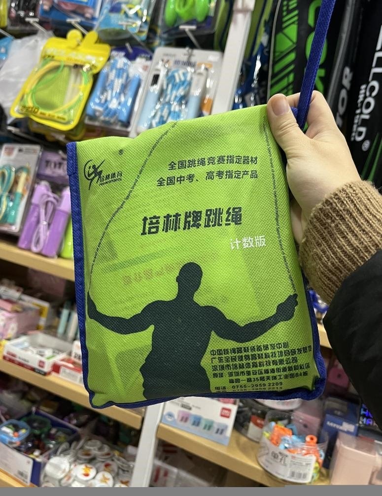 在重慶,記者以家長身份走訪主城區(qū)多家中學(xué)周邊文具店,問及是否售賣“中考跳繩”時,多名店主不約而同向記者推薦同一品牌——培林牌跳繩。