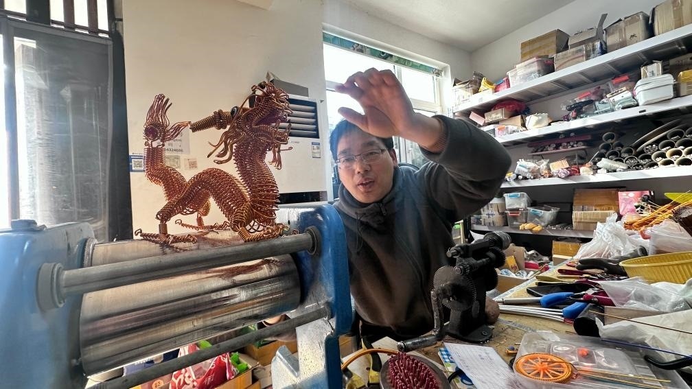 在村民楊訓政不大的鋁編工作室內,簡易貨架上一排排銅色鋁線編制成的藝術品讓人目不暇接。一條條鋁制彈簧經過村民巧妙處理后,成了工藝品市場的搶手貨:發(fā)財樹、恐龍、摩托車、機器人……“我這鋁編雖然產量低、規(guī)模小,訂單可已經排到了今年10月底。龍年將至,來自海內外的訂單讓大家年前忙得不亦樂乎?!睏钣栒贿呌勉Q子擺弄著鋁編小龍,一邊告訴記者。