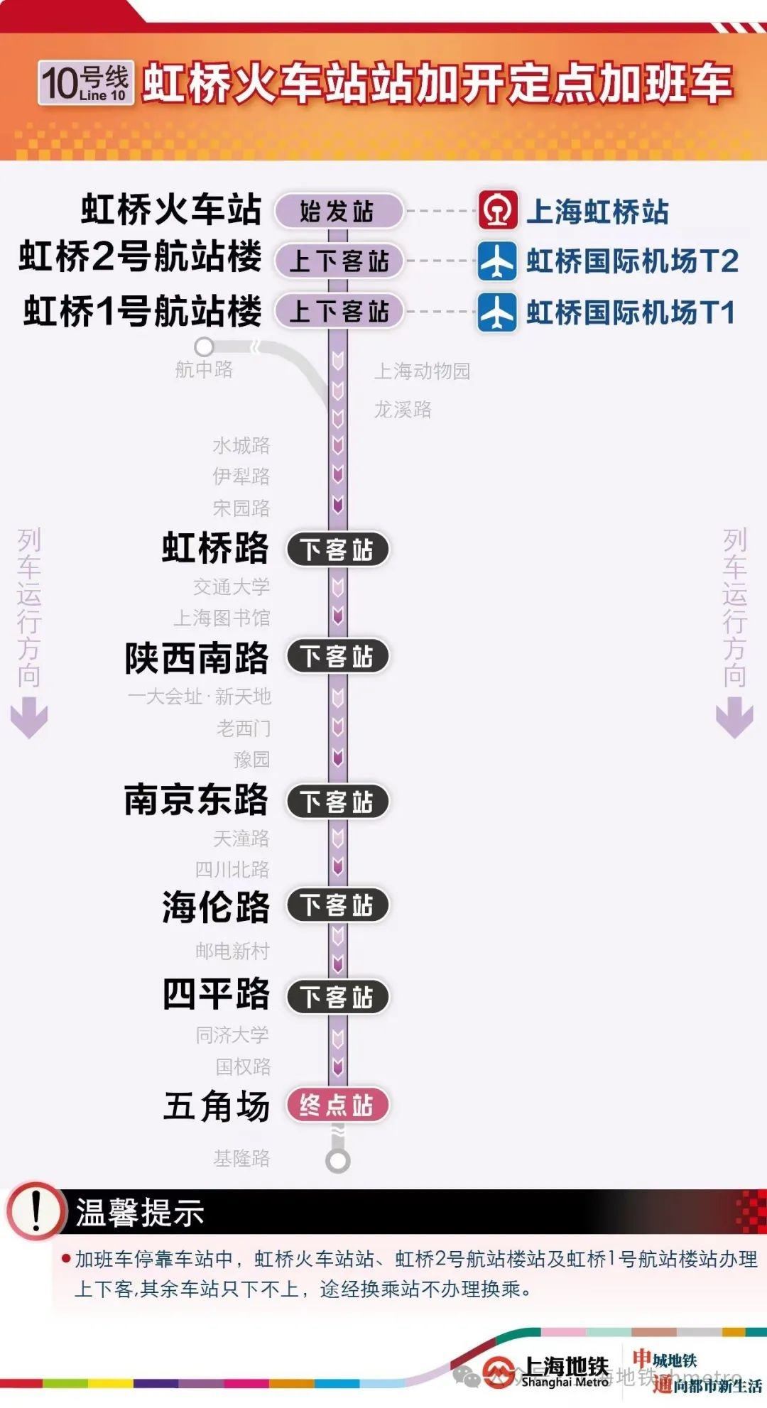 今日,10號線虹橋火車站加班車延長至2月18日2:30。其中,10號線虹橋火車站站往五角場站方向定點(diǎn)加班車沿途僅??亢鐦蚧疖囌菊?、虹橋2號航站樓站、虹橋1號航站樓站、虹橋路站、陜西南路站、南京東路站、海倫路站、四平路站、五角場站,其余車站跳停。??寇囌局?,虹橋火車站站、虹橋2號航站樓站、虹橋1號航站樓站可同時上下客,其余車站只下不上,途經(jīng)換乘站不可換乘。