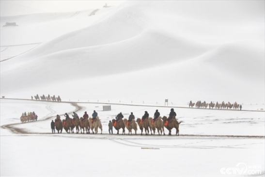2024年2月18日,甘肅酒泉,游客在敦煌市鳴沙山月牙泉景區(qū)游覽。雪后的甘肅省敦煌市鳴沙山月牙泉景區(qū)銀裝素裹,景色如畫,游客徜徉其中,欣賞大漠雪景,體驗(yàn)絲路風(fēng)情。