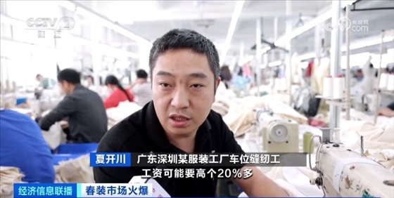 深圳另一家服裝工廠里,一批批春裝整齊地堆放在車間,正等著最后的包裝發(fā)貨。這兩天,這些春裝將發(fā)往全國各地。朱以做服裝批發(fā)已經有九個年頭,他表示,目前的訂單同比增長超3倍,工廠訂單排期已經到了兩個月后,最近工廠也在不斷招人提升產能。
