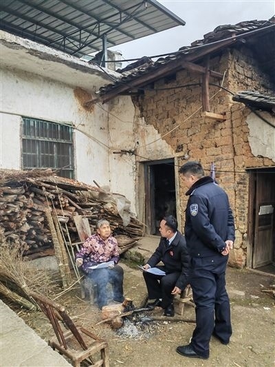 圖②:法官向被告同住的兒子送達(dá)法律文書,并解答其提出的法律問題,法警全程錄音錄像。