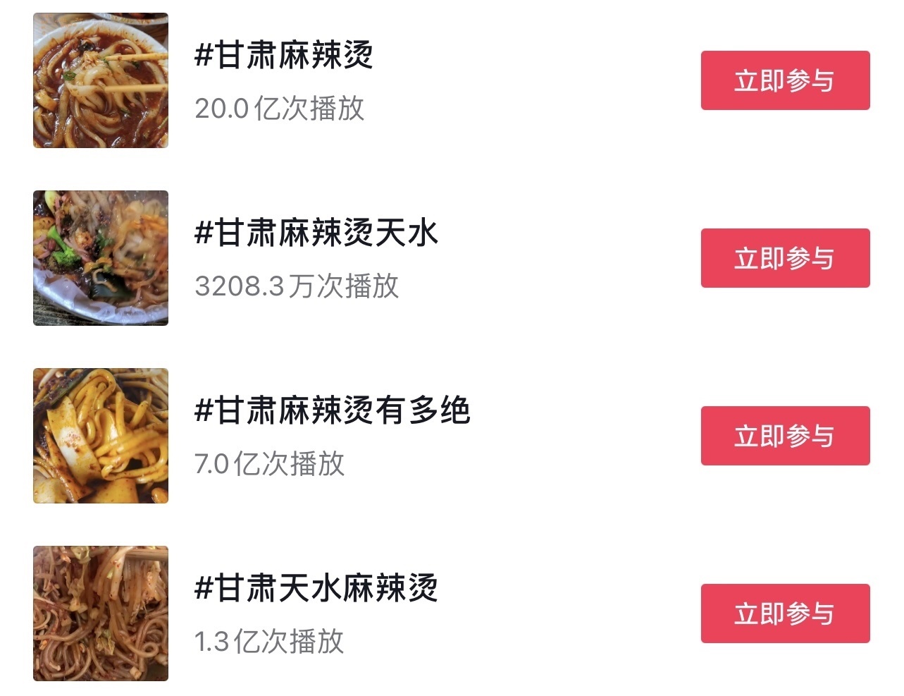 “這兩條視頻吸引了大量網(wǎng)民觀看、點贊、轉(zhuǎn)發(fā),之后陸續(xù)有網(wǎng)民發(fā)布相關視頻?!?月18日,甘肅省文化和旅游廳在回復網(wǎng)友建議中提到,3月份以來,“甘肅麻辣燙”話題迅速發(fā)酵,視頻內(nèi)容迅速增加,多次登上抖音、快手等短視頻平臺熱榜。截至3月16日18:00,各大短視頻平臺上“甘肅麻辣燙”相關話題累計播放量已超過32.6億次。