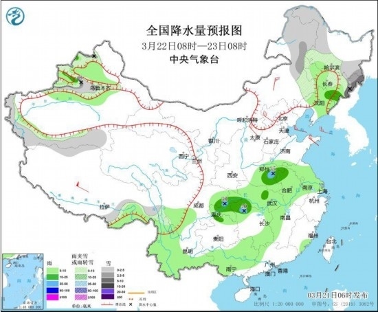3月23日08時至24日08時,新疆沿天山高海拔地區(qū)、昆侖山脈地區(qū)、青海大部、甘肅中東部、內(nèi)蒙古東北部、黑龍江北部、西藏東部等地部分地區(qū)有小到中雪或雨夾雪,其中,青海東北部等地部分地區(qū)有大雪(5~8毫米)。陜西北部、黃淮西部和南部、江淮、江漢大部、江南北部等地部分地區(qū)有中到大雨,其中,安徽東北部、江蘇中北部、湖北東南部、湖南東北部、江西北部等地部分地區(qū)有暴雨,局地大暴雨(100~110毫米)。內(nèi)蒙古中東部、遼東半島、河北東北部、山東半島、江蘇北部沿海等地部分地區(qū)有4~6級風(fēng)。黃海大部海域有5~7級風(fēng),陣風(fēng)8級。