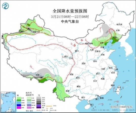 3月21日08時至22日08時,新疆北部和南疆西部山區(qū)、內(nèi)蒙古東南部、遼寧西部和北部、河北北部、西藏東部和南部等地部分地區(qū)有小到中雪或雨夾雪,其中,新疆沿天山高海拔地區(qū)等地有大到暴雪,局地大暴雪(20~22毫米)。新疆伊犁河谷和準(zhǔn)噶爾盆地、遼寧東部和南部、北京、天津、云南中西部、西藏東南部等地部分地區(qū)有小雨,其中,遼東半島等地部分地區(qū)有中雨。青海東部、內(nèi)蒙古中西部和東南部、河北西北部等地部分地區(qū)有4~6級風(fēng)。臺灣海峽、巴士海峽、南海大部海域有6~8級風(fēng),陣風(fēng)9級。內(nèi)蒙古中西部部分地區(qū)有揚沙或浮塵,局地有沙塵暴。