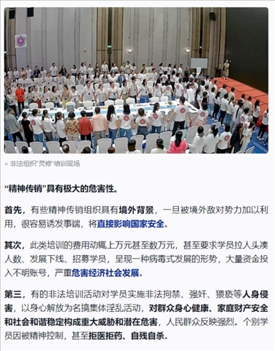 ·起底被公安機(jī)關(guān)打擊查處的“靈修”組織:打著“靈修”“靈魂塑造”等旗號(hào),對(duì)學(xué)員實(shí)施精神控制;借“靈修”提升之名,行“精神傳銷”之實(shí)。鄧海鵬及其創(chuàng)辦的培訓(xùn)機(jī)構(gòu),打著“靈魂塑造”“集體場(chǎng)域”的幌子,對(duì)學(xué)員進(jìn)行精神控制,然后以傳銷、加盟、進(jìn)階等現(xiàn)代營(yíng)銷模式達(dá)到斂財(cái)漁色目的。人前他要求學(xué)員全部吃素,自己每天大魚大肉,必吃海參;人前他要求學(xué)員不能有不動(dòng)產(chǎn)、錢是修行來的,自己卻拿著騙來的錢去買理財(cái)產(chǎn)品;人前他無兒無女,實(shí)則有妻有女;人前假裝不近女色,背地里卻漁色女學(xué)員。