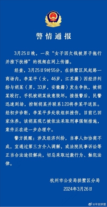 ·杭州拱墅警方通報(bào)女子被拖行推下扶梯:因經(jīng)濟(jì)糾紛起爭(zhēng)執(zhí),男子被依法采取刑事強(qiáng)制措施。