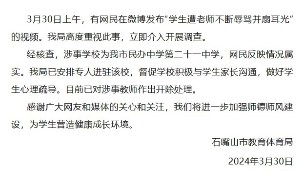 3月30日上午,有網(wǎng)民在微博發(fā)布“學(xué)生遭老師不斷辱罵并扇耳光”的視頻。石嘴山市教育體育局高度重視此事,立即介入開(kāi)展調(diào)查。