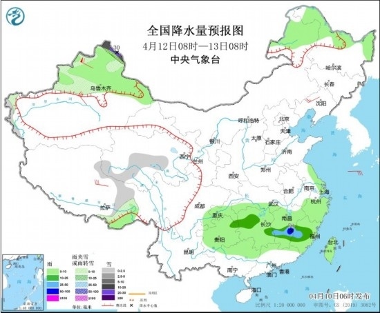 4月12日08時至13日08時,新疆北疆北部和沿天山地區(qū)、西藏東部、青海南部等地部分地區(qū)有小到中雪或雨夾雪,其中,新疆北疆北部的部分地區(qū)有大到暴雪,局地大暴雪(20~30毫米)。貴州西北部、湖南中部、江西中部、福建中部等地部分地區(qū)有中到大雨,其中,江西東部的部分地區(qū)有暴雨(50~70毫米)。新疆南疆盆地、西藏北部、遼寧西部等地部分地區(qū)有4~6級風,其中,新疆北疆北部部分地區(qū)有8~9級風;渤海、渤海海峽、黃海大部海域部分海域將有6~7級。