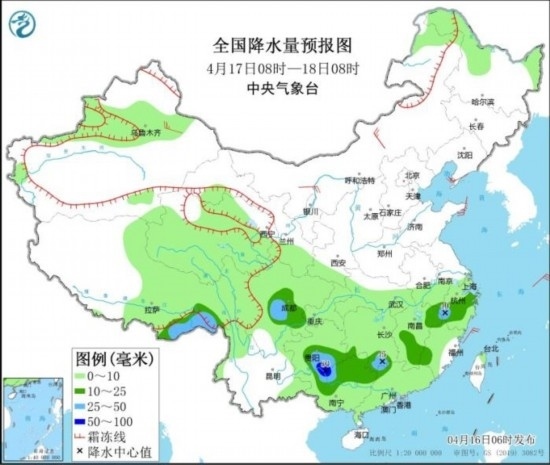 4月17日08時至18日08時,四川盆地南部、貴州南部、湖南南部、江西中南部和東部、浙江中部、廣西中北部、廣東西北部等地部分地區(qū)有中到大雨,其中,貴州南部、廣西西北部等地部分地區(qū)有暴雨(50~80毫米)。內蒙古中西部、遼東半島、山東半島、新疆東部等地部分地區(qū)有4~6級風。