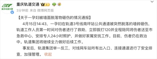 央視網(wǎng)消息:據(jù)@重慶軌道交通 微博通報,4月15日14:43,一孕婦在軌道3號線南坪站公共通道被突然脫落的墻磚砸傷,軌道工作人員第一時間對傷者進(jìn)行了救助,立即撥打120并全程陪同將傷者送至市急救中心,安排專人24小時照護,并做好家屬安撫工作。目前,傷者仍在救治中。軌道集團將繼續(xù)全力做好后續(xù)工作。