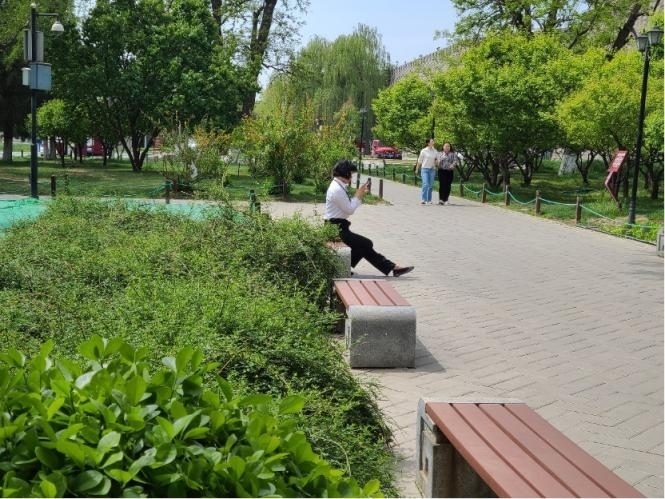 中午1時,走進北京明城墻遺址公園,春色襲人。玉棠廣場中,半數(shù)以上的人身著偏正式服裝或佩戴著工牌。他們有的獨坐小憩,有的兩人結伴,有的三五成群。在亭廊軒組合處,四位女士圍坐在一起交流生活中的小事,不時傳出陣陣笑聲。