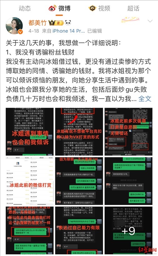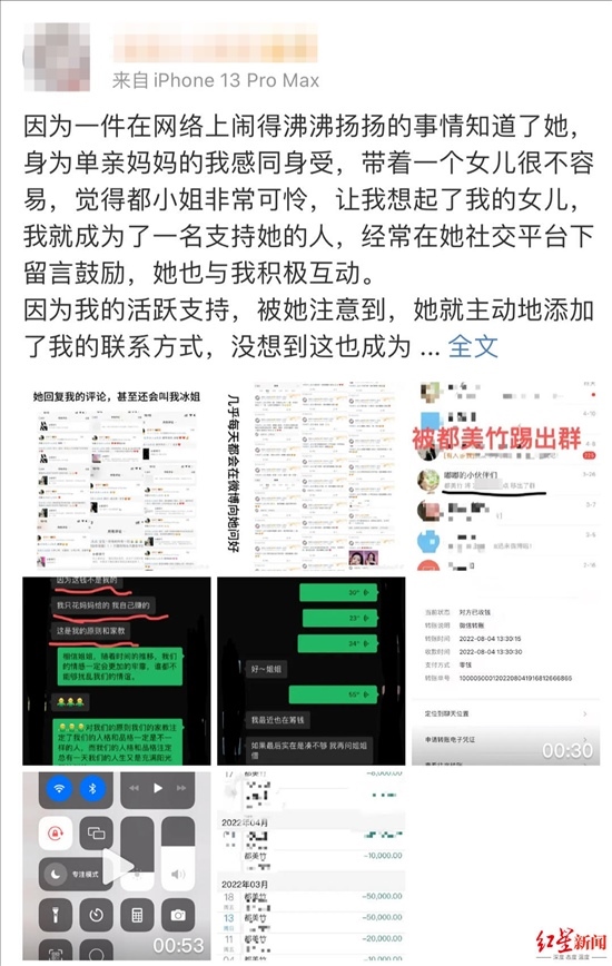 4月15日,都美竹粉絲朱姐發(fā)文稱,她先后給都美竹轉(zhuǎn)款近20萬(wàn)元,現(xiàn)在認(rèn)為都美竹“賣(mài)慘”騙錢(qián)。她希望都美竹還錢(qián),但對(duì)方只給她轉(zhuǎn)了3萬(wàn)元。