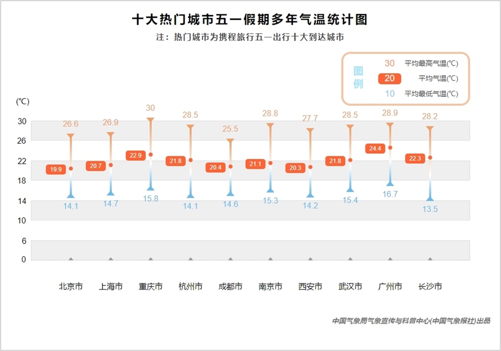 南北方熱門城市“五一”假期的氣溫差異并不大,都非常適宜出行,最高氣溫均在25℃以上。重慶是唯一一個在“五一”期間平均最高氣溫達(dá)到30℃的熱門城市,熱度與溫度都在高位,前往還需注意防暑降溫。