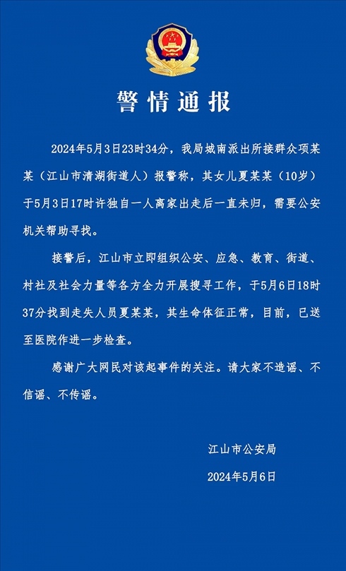 央視網(wǎng)消息:據(jù)江山公安微信公眾號消息,5月6日,浙江衢州江山市公安局通報,5月3日23時34分,警方接群眾項某某(江山市清湖街道人)報警稱,其女兒夏某某(10歲)于5月3日17時許獨自一人離家出走后一直未歸,需要公安機關幫助尋找。接警后,江山市立即組織公安、應急、教育、街道、村社及社會力量等各方全力開展搜尋工作,于5月6日18時37分找到走失人員夏某某,其生命體征正常,目前,已送至醫(yī)院作進一步檢查。