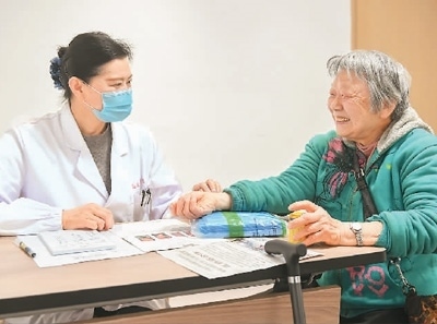 安徽省合肥市廬陽(yáng)區(qū)養(yǎng)老服務(wù)指導(dǎo)中心與安徽中醫(yī)藥大學(xué)門(mén)診部(國(guó)醫(yī)堂)醫(yī)聯(lián)體合作揭牌,該醫(yī)聯(lián)體開(kāi)設(shè)中醫(yī)科門(mén)診,助力老年群體樂(lè)享健康的晚年生活。圖為安徽中醫(yī)藥大學(xué)門(mén)診部(國(guó)醫(yī)堂)專(zhuān)家(左)為廬陽(yáng)區(qū)老年人義診治療。袁 兵攝(人民圖片)