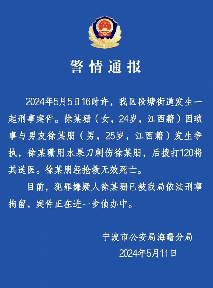 央視網(wǎng)消息:5月11日,寧波市公安局海曙分局發(fā)布警情通報(bào),5月5日16時(shí)許,海曙區(qū)段塘街道發(fā)生一起刑事案件。徐某珊(女,24歲,江西籍)因瑣事與男友徐某朋(男,25歲,江西籍)發(fā)生爭(zhēng)執(zhí),徐某珊用水果刀刺傷徐某朋,后撥打120將其送醫(yī)。徐某朋經(jīng)搶救無(wú)效死亡。目前,犯罪嫌疑人徐某珊已被海曙分局依法刑事拘留,案件正在進(jìn)一步偵辦中。