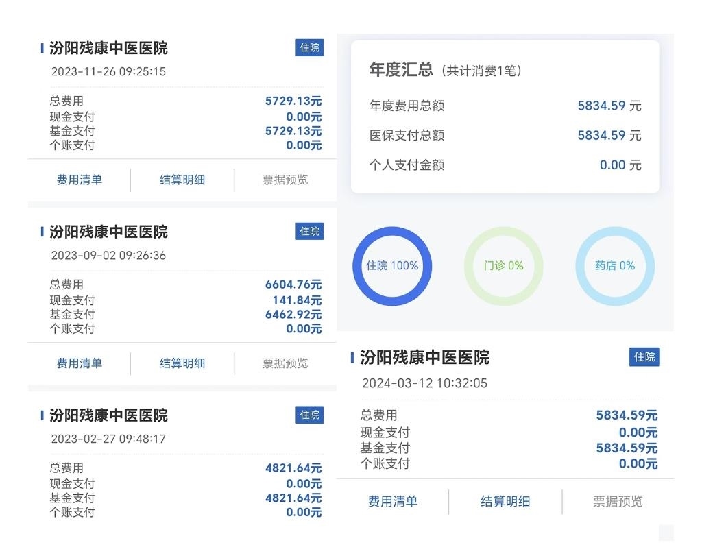 上圖是在國(guó)家醫(yī)保報(bào)銷平臺(tái)上查詢到的某位五保老人在殘康中醫(yī)醫(yī)院的醫(yī)保報(bào)銷記錄,2023年住院3次,2024年春季住院1次。(拼板照片)新華社發(fā)(楊哲攝)