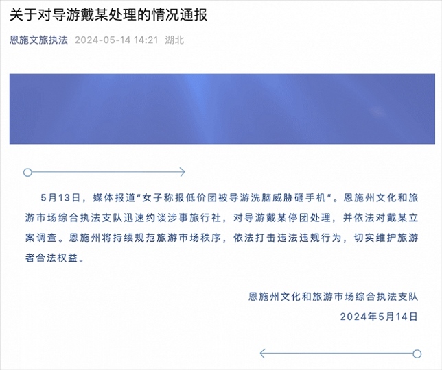 央視網(wǎng)消息:湖北恩施州文化和旅游市場綜合執(zhí)法支隊5月14日通報,5月13日,媒體報道“女子稱報低價團被導游洗腦威脅砸手機”。恩施州文化和旅游市場綜合執(zhí)法支隊迅速約談涉事旅行社,對導游戴某停團處理,并依法對戴某立案調(diào)查。恩施州將持續(xù)規(guī)范旅游市場秩序,依法打擊違法違規(guī)行為,切實維護旅游者合法權(quán)益。