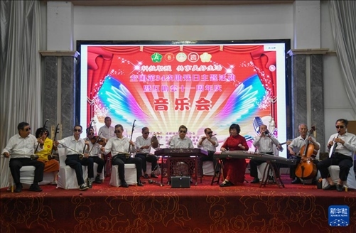 5月13日,“自強不息藝術團盲人樂隊”成員在周年慶上演出。新華社記者 胥冰潔 攝