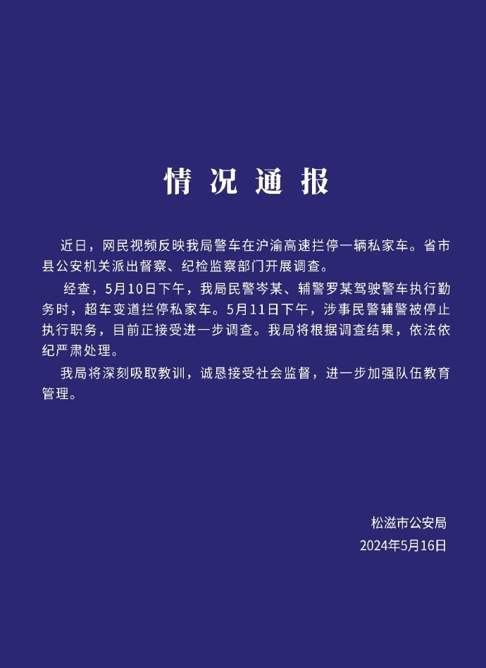 ·警車高速公路逼停小車,湖北松滋警方通報(bào):涉事民輔警被停職。