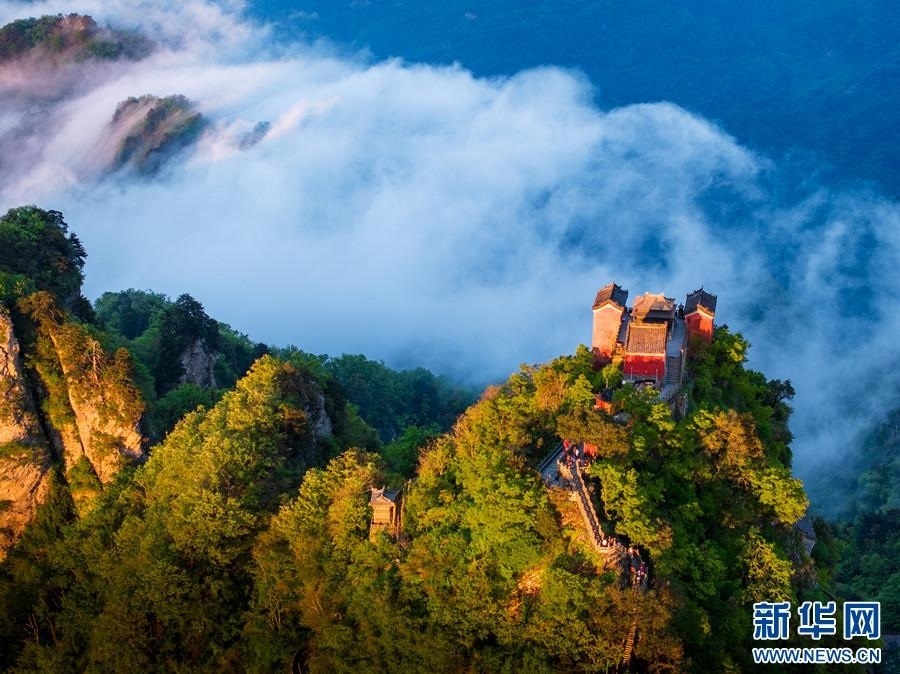 五月的武當(dāng)山,云霧升騰,浩瀚無垠,靈性的古建筑若隱若現(xiàn),如同水墨畫卷,勝似仙山瓊閣,氣勢磅礴,蔚為壯觀,給游客帶來無限遐想與向往。